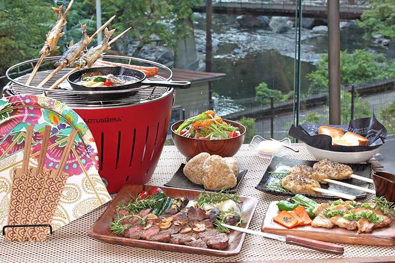 近くの山で採れた山菜や、地元農家さんのこだわり野菜など、やどりならではのお料理を自然の中でゆっくりとお楽しみください。山の幸のイノシシや鹿、橋本市の名産品の玉子、ひね鶏などもご用意しております。川の幸の鮎など、清流の川魚も楽しんで頂けます。